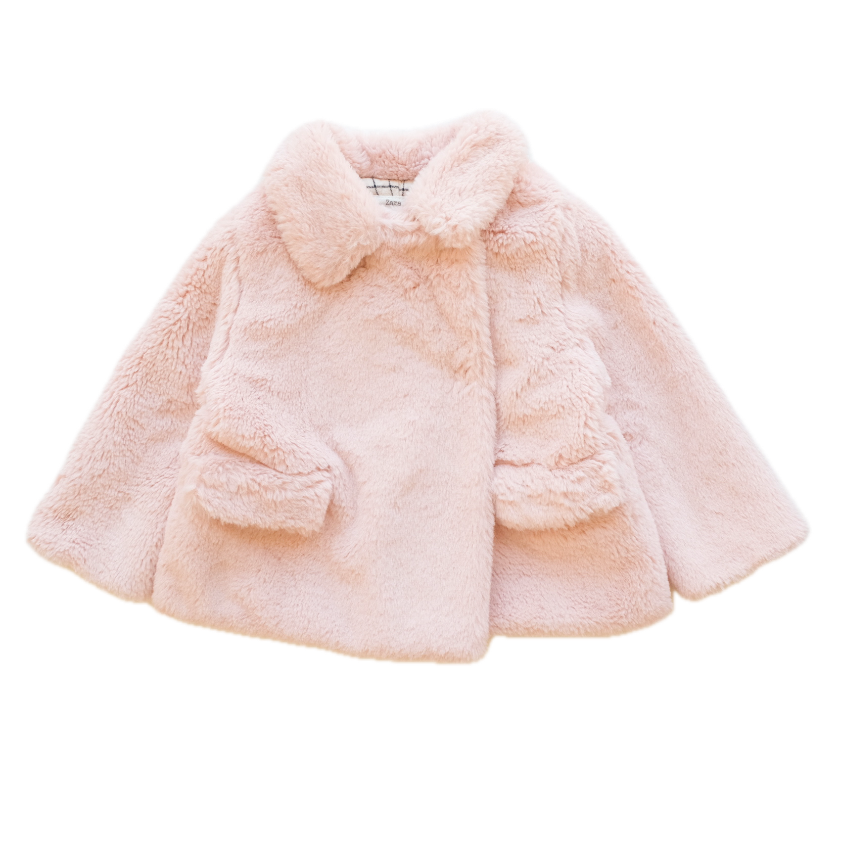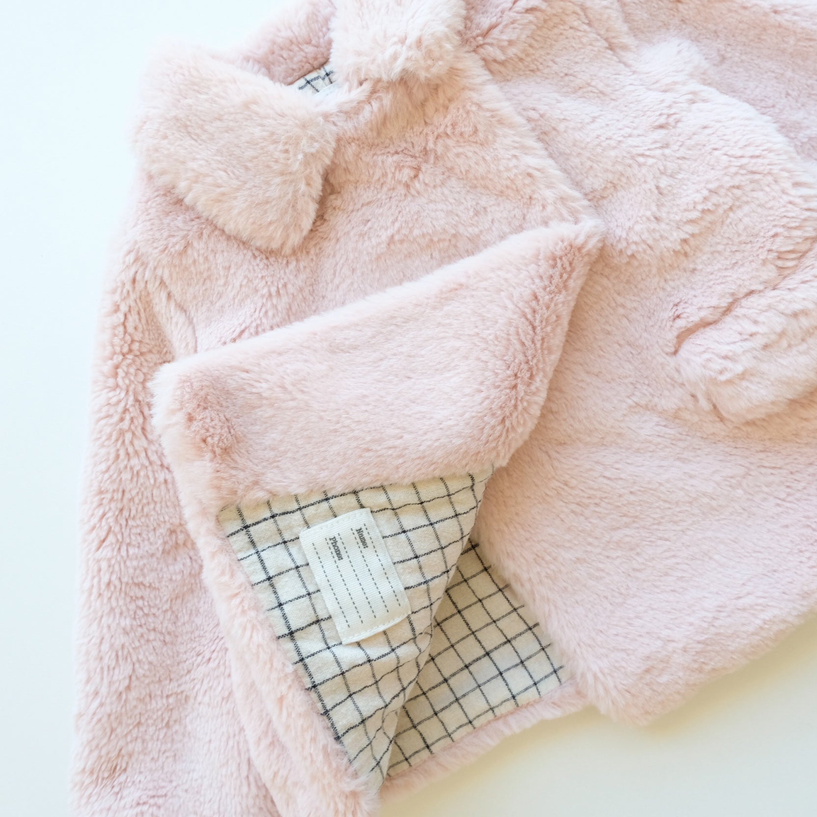 Veste à manches longues en fausse fourrure rose clair. Boutons pressions au devant. Doublure intérieure en coton imprimé carreaux. Très chouette et bien couvrante.