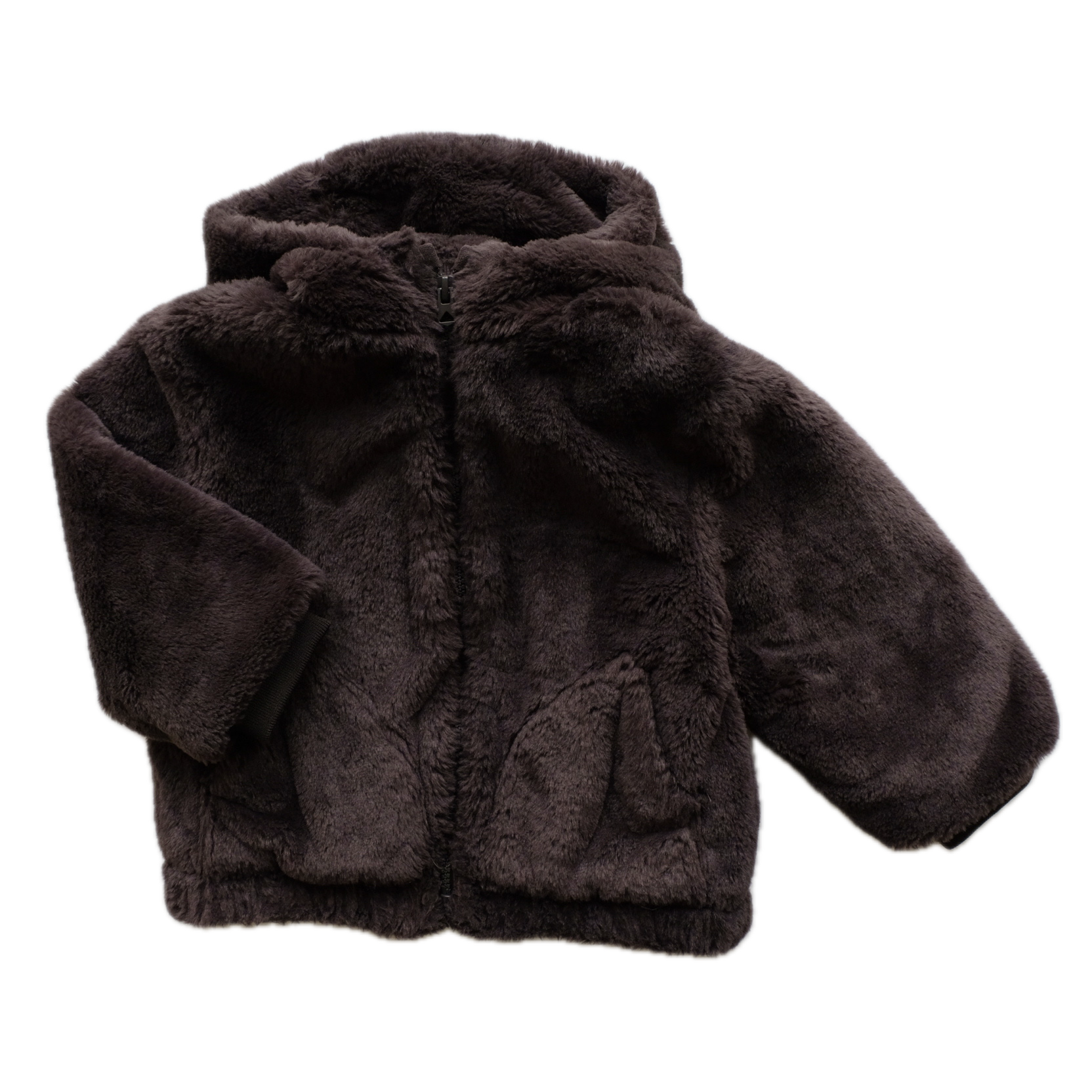 Veste chaude à manches longues, en fausse fourrure coloris marron uni. Capuche intégrée, zip au devant. Doublure intérieure beige avec imprimé pois all over. Très sympa et super douce !